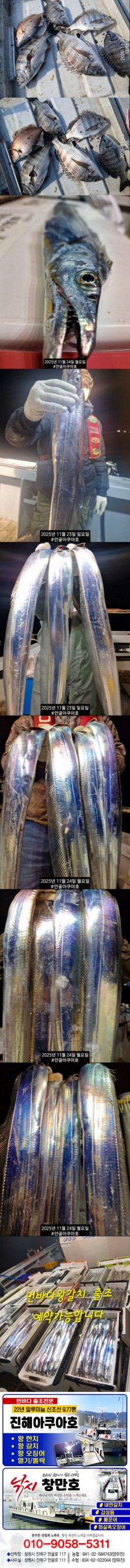 어제 갈치는 지진여파인지 빠져나간건지 도통 갈치 마릿수가 없습니다 당분간 갈치는 접고창만호감성돔카고 출조 쭉 출조합니다(목,금,토,일 예약가능)<진해 아쿠아호&창만호 밴드> 바로가기 클릭https://band.us/band/6 (예약문의 : 010-9058-5311)오시는길 : 경남 창원시 진해구 안골로 111(사무실)경남 창원시 진해구 안골로 117(선착장)